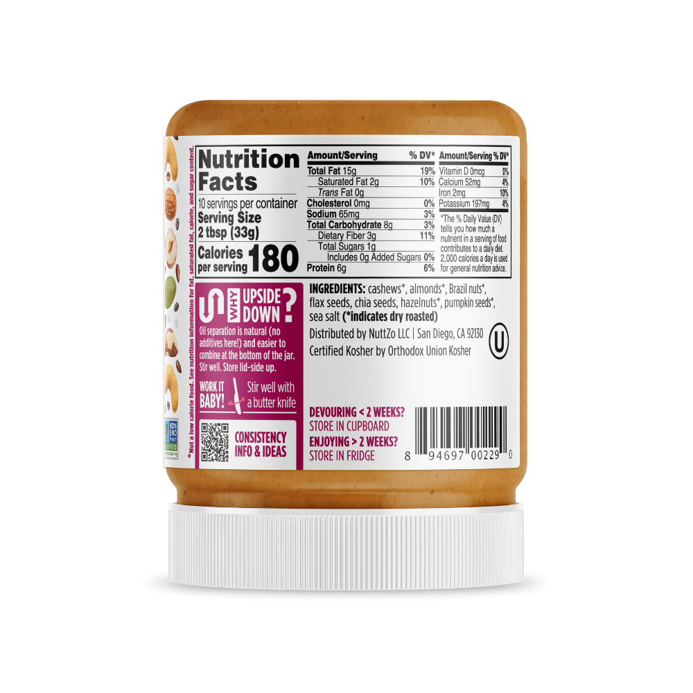 Elevate your almond or peanut butter to 7 nuts and seeds! Enjoy this delicious blend that's made without peanuts. Add to smoothies for a protein punch, drizzle on your favorite pancakes or desserts, spread on fruit, crackers and veggies, or enjoy by the spoonful–however you like, snack on! Made with organic and non-gmo ingredients. NO added sugar or oils.