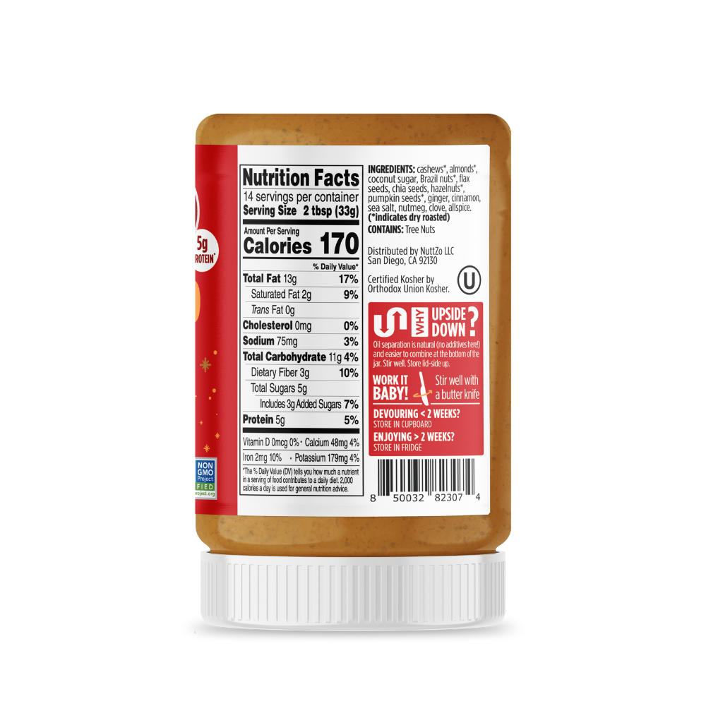 One spoonful and you’ll swear you’ve just had a gingerbread cookie from Grandma’s house. NuttZo Gingerbread nut and seed butter contains the perfect balance of cinnamon, ginger, a touch of cloves, nutmeg, and allspice. Coconut sugar adds a touch of sweetness but only adds 4g of sugar per serving, making this spread the perfect holiday snack.